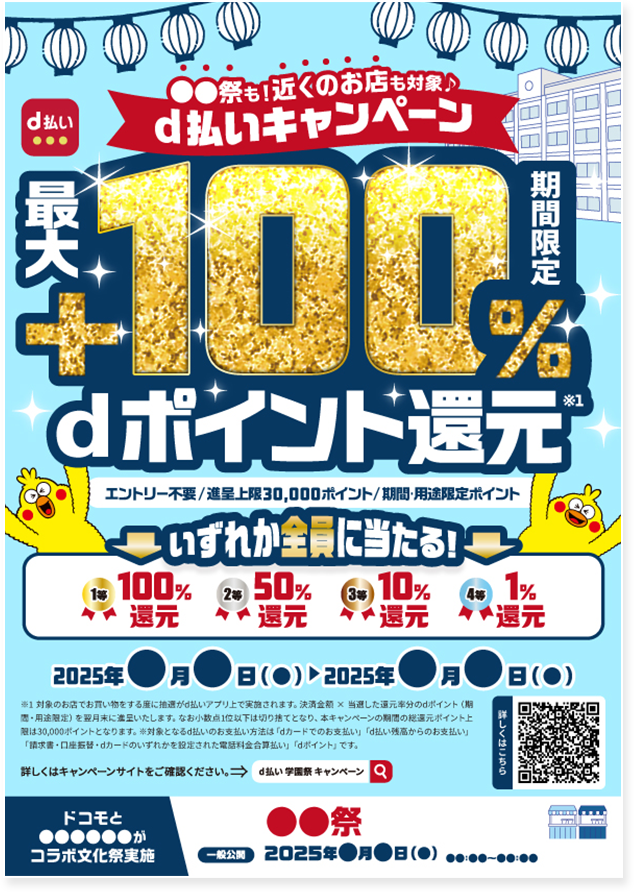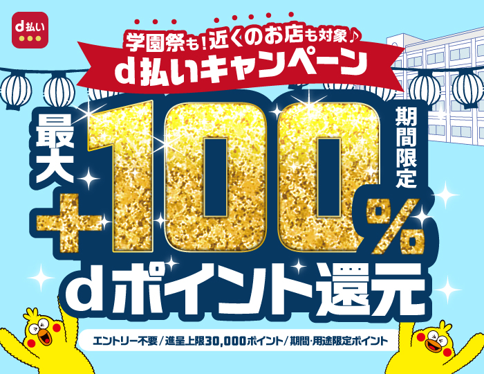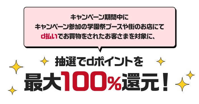 キャンペーン期間中に、キャンペーン対象店舗にて d払いでお支払いされたお客さまに対して、抽選で引いた等数に応じたdポイント(期間・用途限定)を進呈いたします。