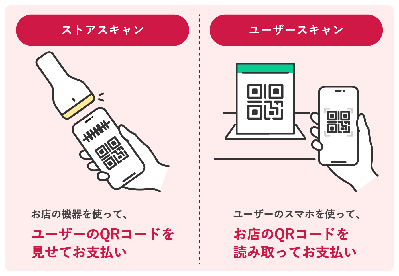 決済の方法は2種類あり、お客さまのスマートフォンの画面に表示したQRコードを店舗がスキャンする「ストアスキャン方式」と、店舗が設置したQRコードをお客さまがスマートフォンで読み取る「ユーザースキャン方式」があります。