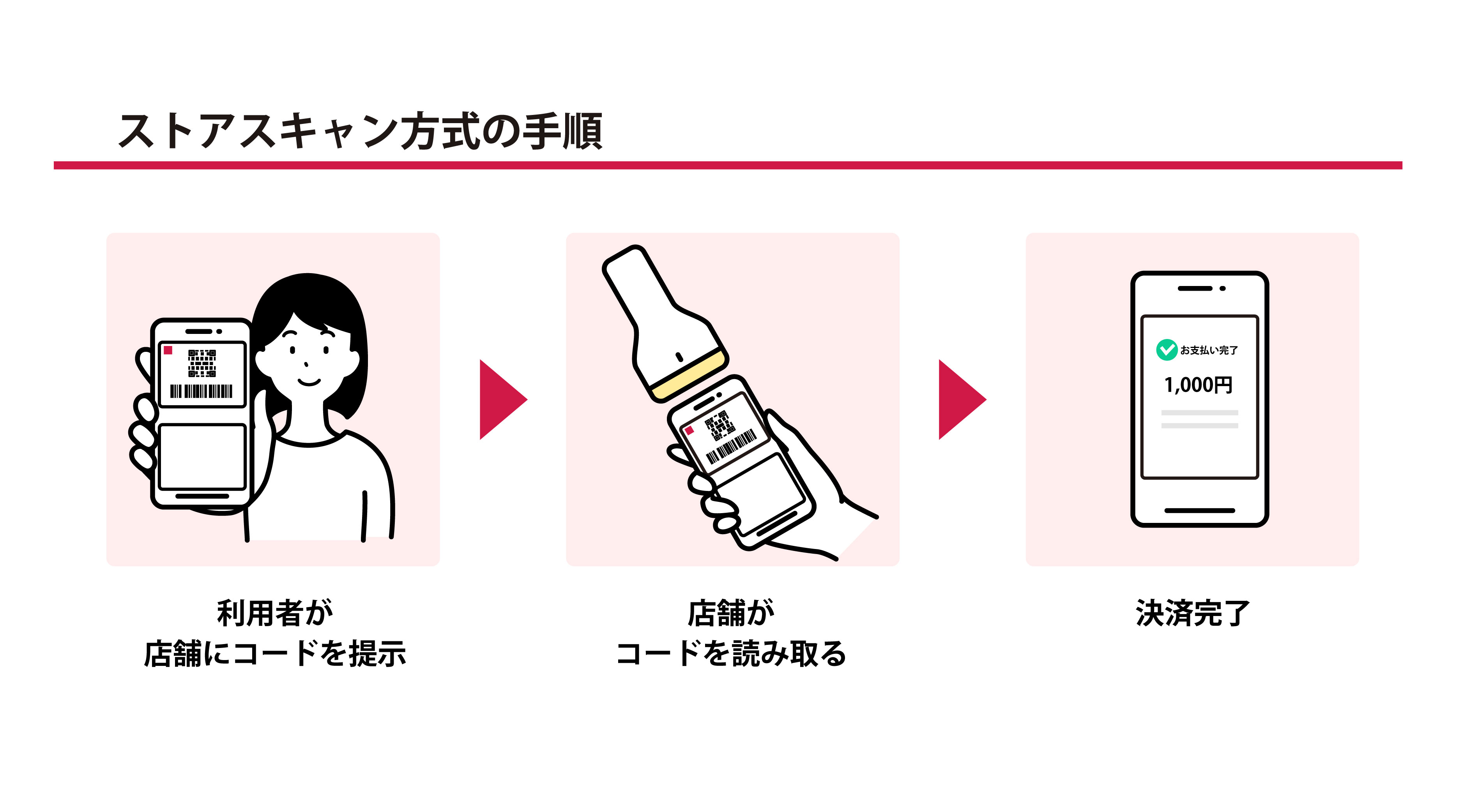 ストアスキャン方式の場合、お客さまがスマートフォン決済アプリでコードを表示させ、店舗スタッフに提示します。店舗スタッフが決済端末でコードを読み取れば、決済完了です。