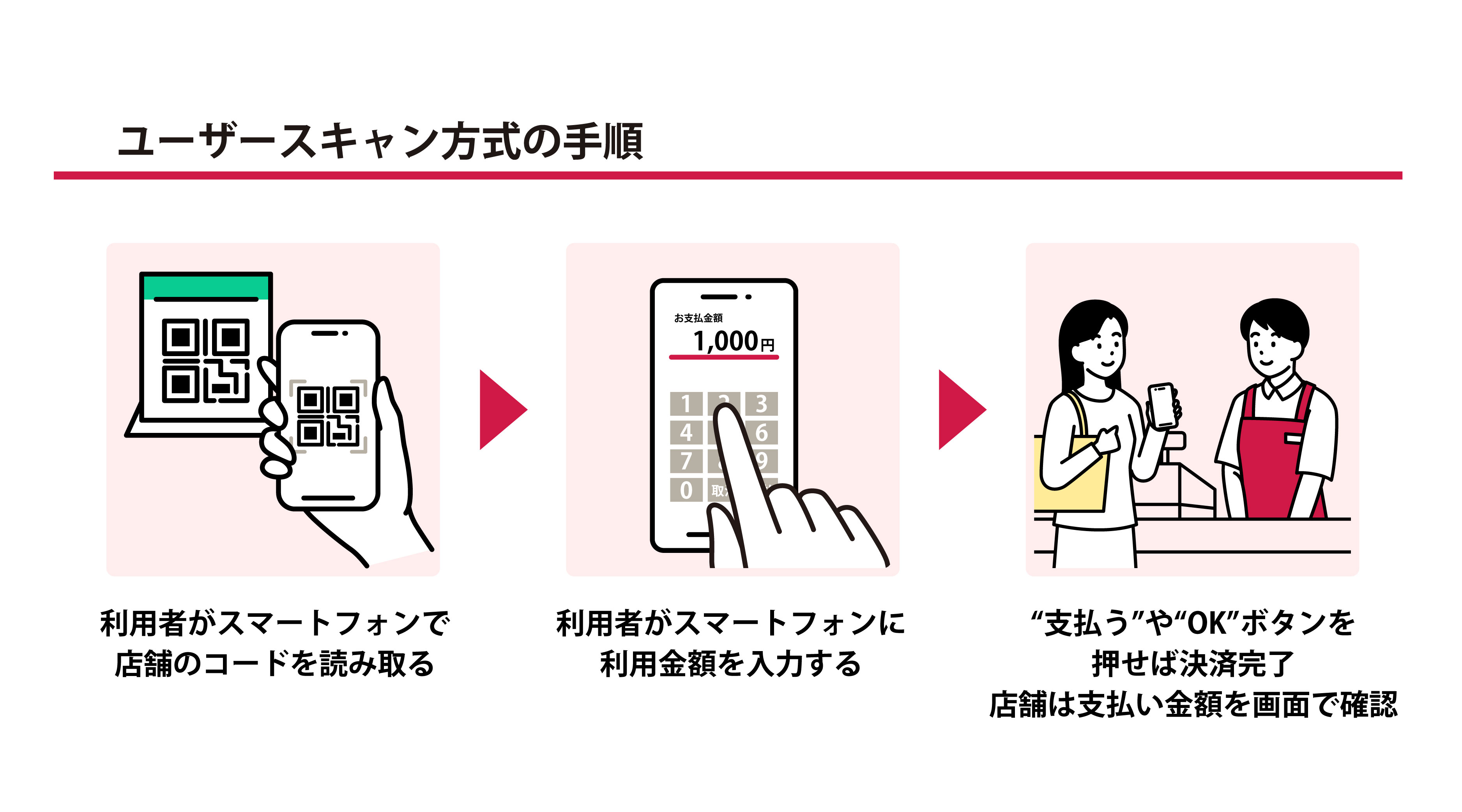 ユーザースキャン方式の場合は、お客さまがスマートフォン決済アプリを開き、店頭に掲示されているコードを読み取り、利用金額を入力します。店舗スタッフの確認後、「支払う」「OK」などをタップすれば決済完了です。