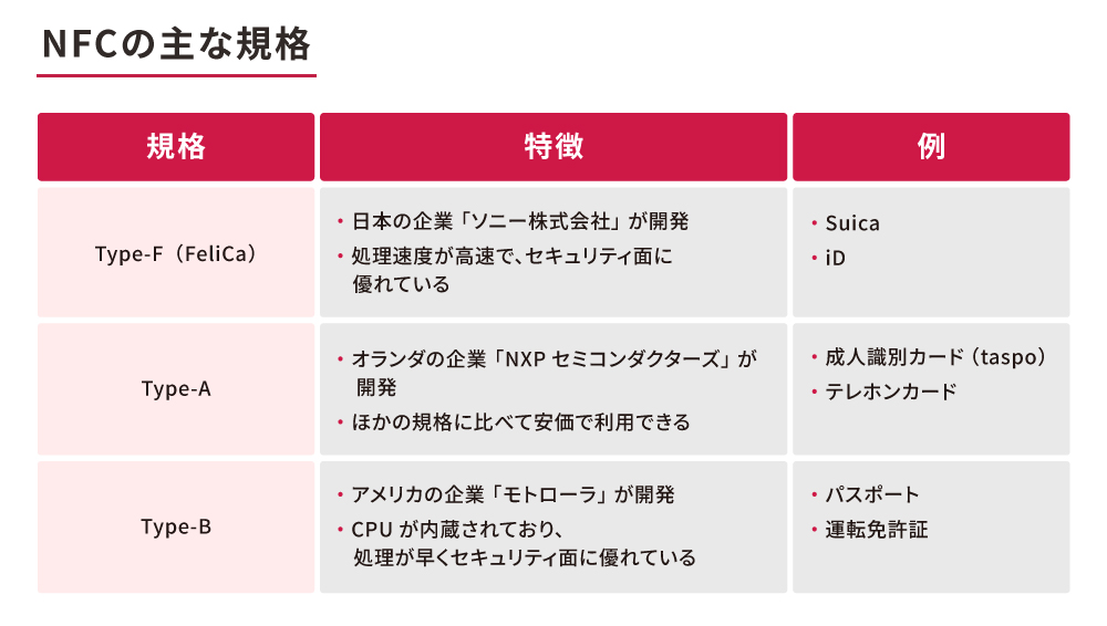 非接触型決済には、国際標準規格の「NFC(Near Field Communication)」という近距離無線通信技術が使用されています。NFCには「Type-F(FeliCa)」「Type-A」「Type-B」などの種類があり、日本と海外では使用されている規格が異なります。