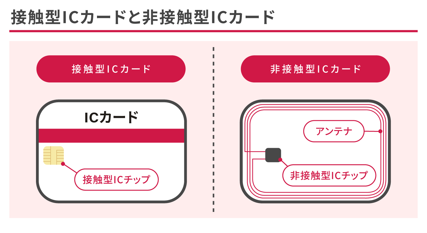 ICカードは、下記のように、大きく「接触型」と「非接触型」の2種類に分けられます。それぞれ詳しく見ていきましょう。