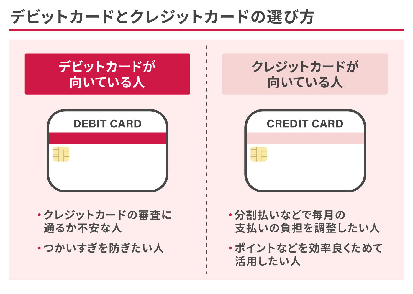つかいすぎを防ぎたい人には、即時引き落としのデビットカードが向いており、分割払いを利用したい人や、ポイ活などでポイント還元を重視する人には、クレジットカードが適しています。