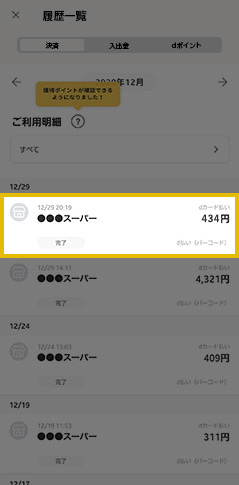 お支払い完了後は、「ホーム」 >「ご利用履歴」から該当のご利用明細をタップすると確認できます