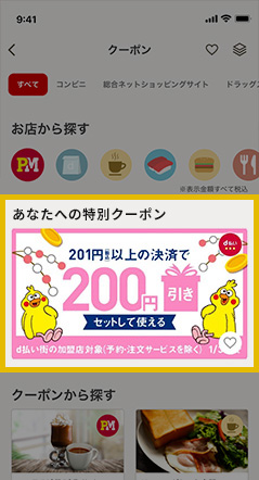 - 「クーポン」の「あなたへの特別クーポン」からもご利用いただけます。ご利用方法はこちら