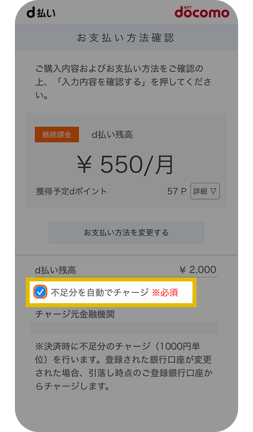 支払い方法をd払い残高で設定する場合、自動的に不足額を補う1,000円単位のチャージが行われます。詳しくはこちら