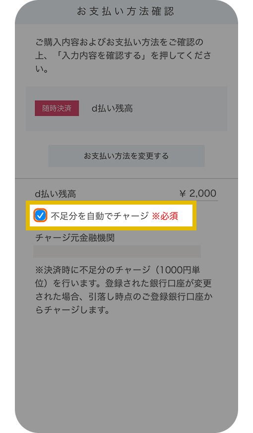 支払い方法をd払い残高で設定する場合、自動的に不足額を補う1,000円単位のチャージが行われます。詳しくはこちら
