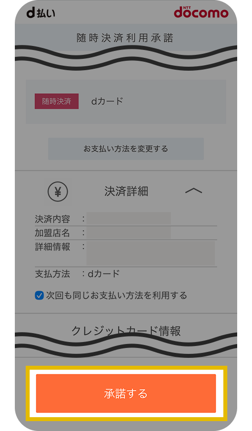 充当方法の設定画面で「dポイントをすべて利用する」または「d払い残高を全て利用する」をタップすると、次回のご利用から適用されます。